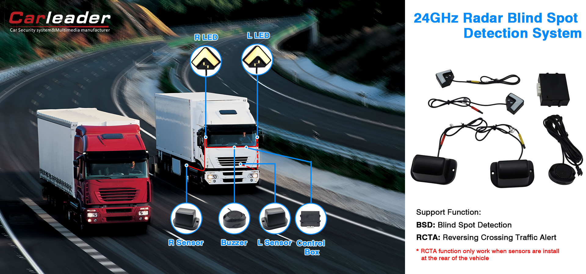 1080P veekindel tahavaatekaamera koos automaatse katikugaCarleaderi 24 GHz radari anduri pimeala tuvastamise süsteem kasutab 24 GHz millimeetri laineradari tehnoloogiat ja superarvutitehnoloogiat, et täita superarvuti andmeid kiire sõidu ajal, tuvastada täpselt vasaku sõiduki ja tagumise kiire sõiduki kauguse ning tuvastada sõiduk reaalajas. Kui sõiduk on ohtlikus pimeala, kasutab 24 GHz millimeetri radari auto BSD pimeala tuvastamise süsteem suminat ning LED -heli ja valguse alarmi, et juhtida juhile viivitamatult vajalikke meetmeid õnnetuste vältimiseks.