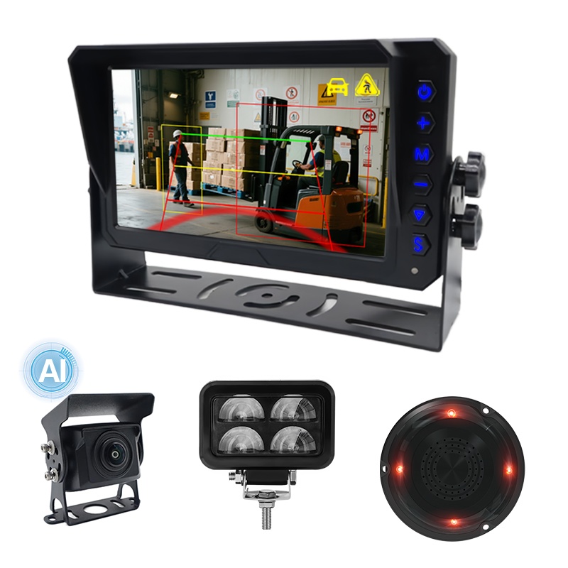 5. AI jalakäijate ja sõidukite tuvastamise laservalguse hoiatuskaamera süsteem kahveltõstuki jaoks, mis on varustatud heli- ja valgusalarmiga, et hoiatada jalakäijat ja sõidukit tõstuki pimedast nurgast lahkumise eest.