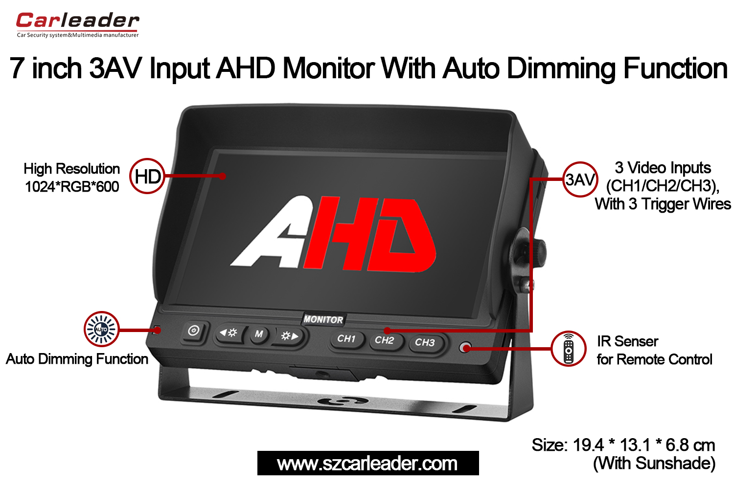 Carleader 7 -tollise 3CH AHD sõidukimonitoron vastupidav 7-tollineAHD MonitorMõeldud sujuvaks integreerimiseks valve- ja autotööstussüsteemidesse. Digitaalse Innoluxi paneeliga 16: 9 kuvasuhtega pakub see karge visuaali eraldusvõimega 1024xRGBX600, tagades kriitiliste rakenduste selguse. Kaasas ka 3 kanaliga AHD videosisendit, mis sobib suurema osa sõiduki nägemise vajadustest.