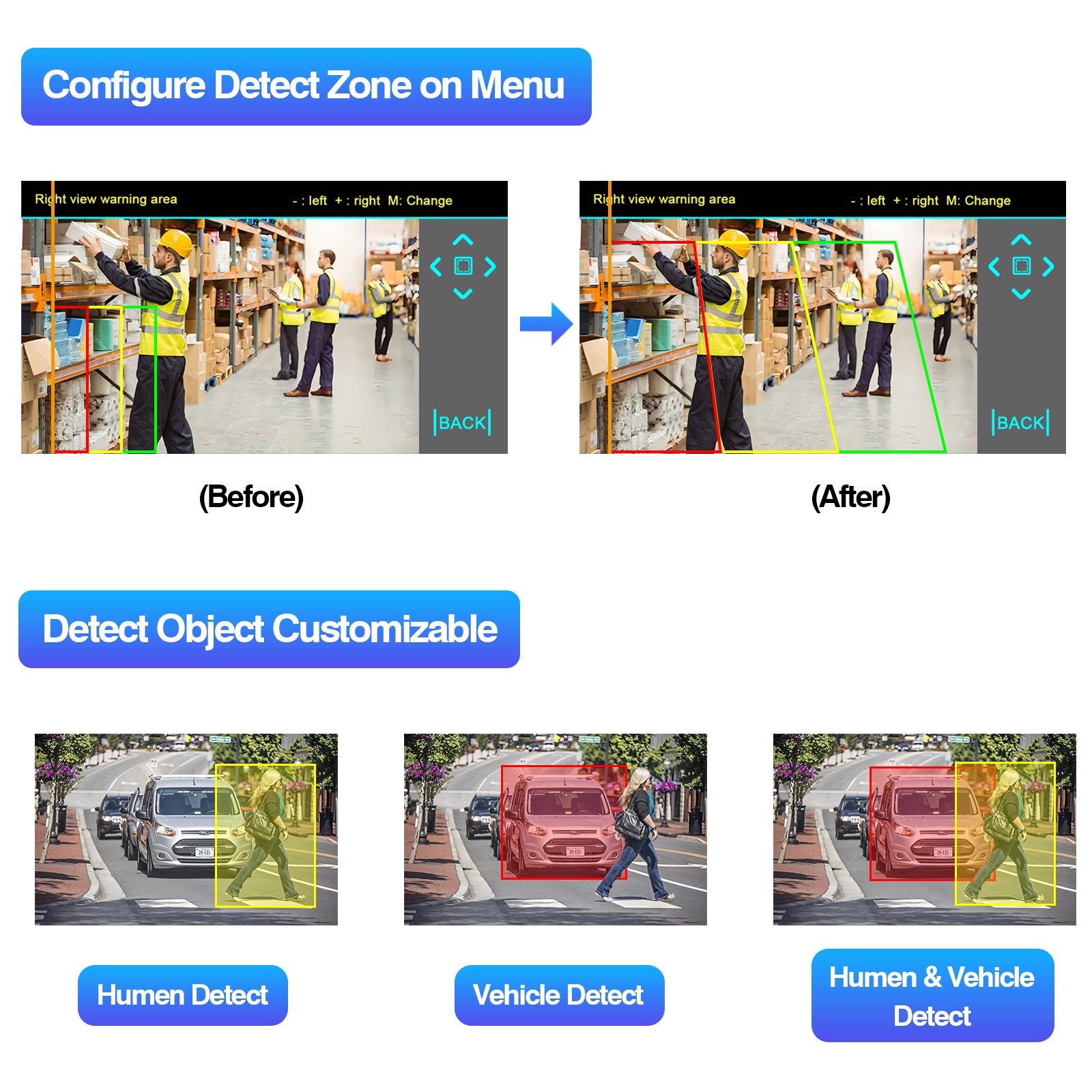 Nutikas tuvastamine: pimedates tsoonides sisenevate objektide reaalajas hoiatused, toetage AI funktsiooni kalibreerimist, reguleeritav trapetsikujuliste kalibreerimisliinide kaudu (roheline hoiatusalade jaoks, sinine sõidukite jama joondamiseks).