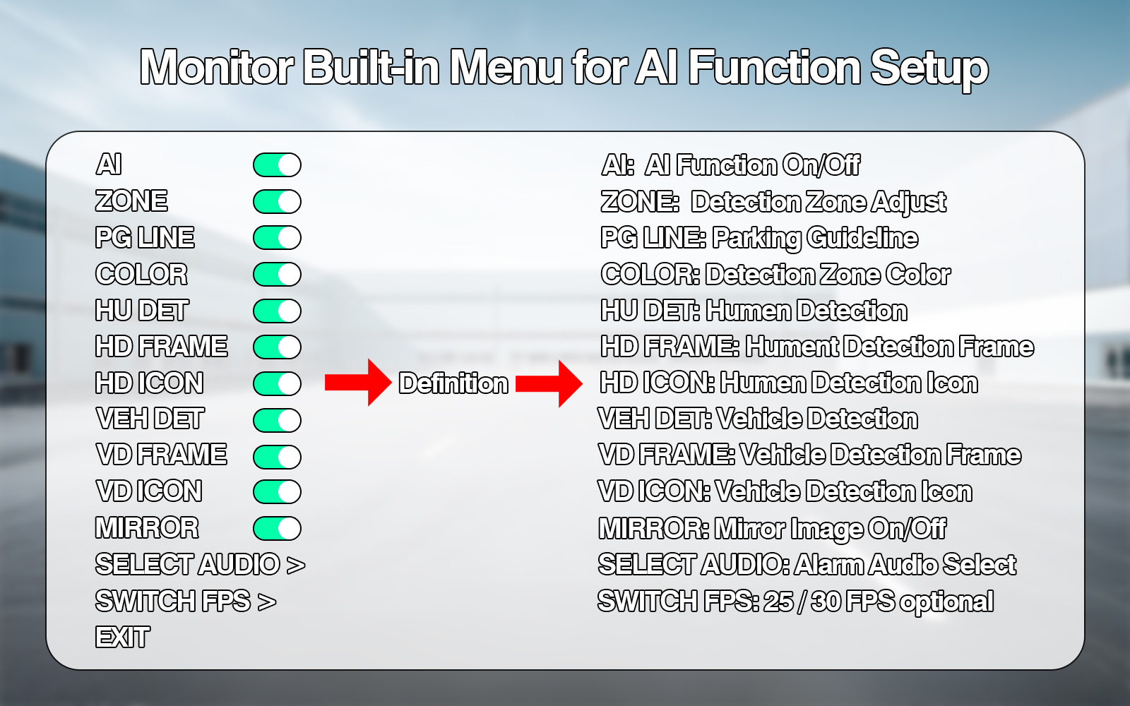 4. Monitori tugi reguleerige arukalt kõiki funktsioone, näiteks AI BSD kaamera pimeda piirkonna skaala hoiatusala.