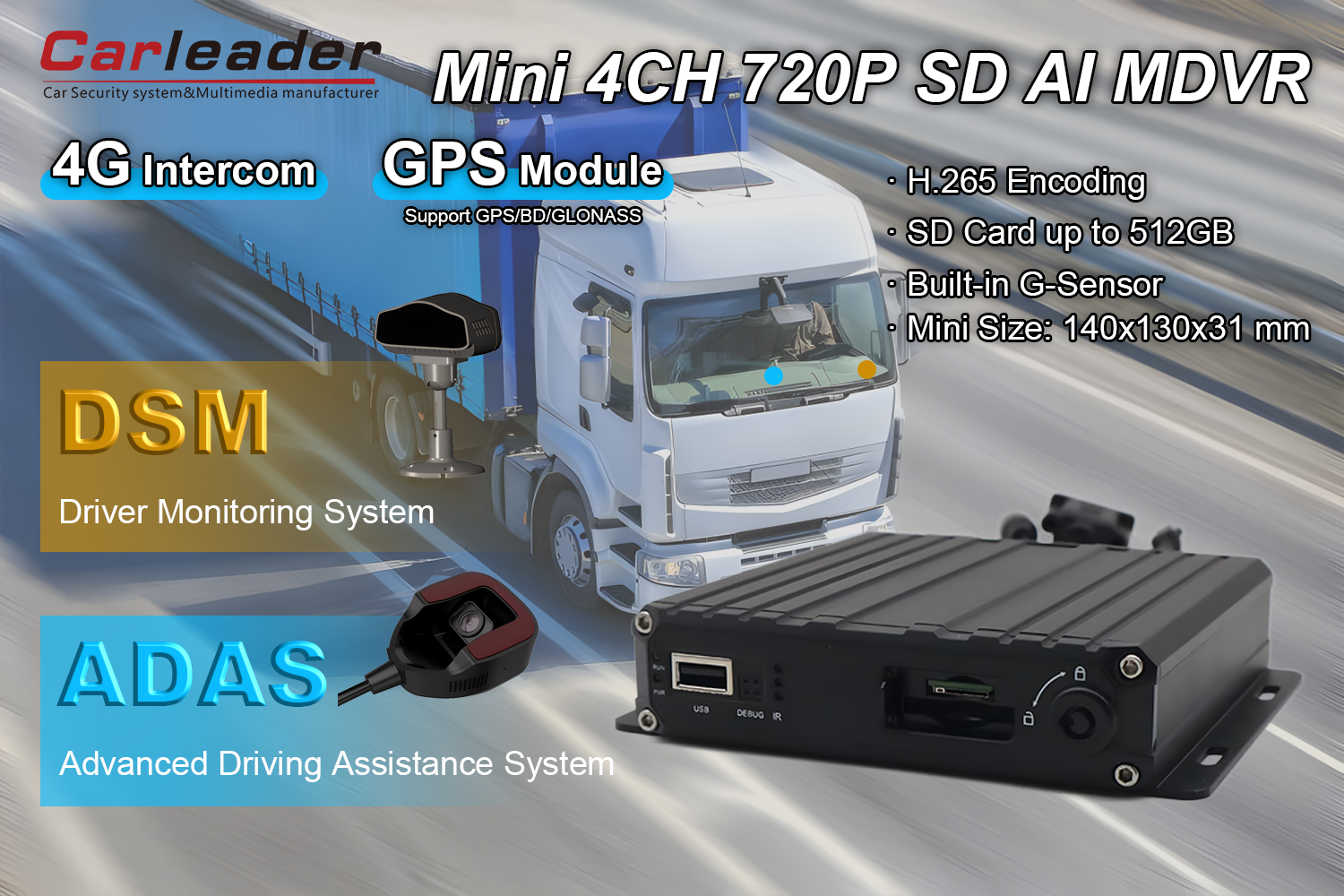 Karleader4CH AI intelligentne mobiilne DVR DSM-i ja ADAS-kaameraga Ideaalne kasutamiseks kommertsparkides, ühistranspordis, korrakaitsesõidukites, isiklikes ja tarbesõidukite turvasüsteemides