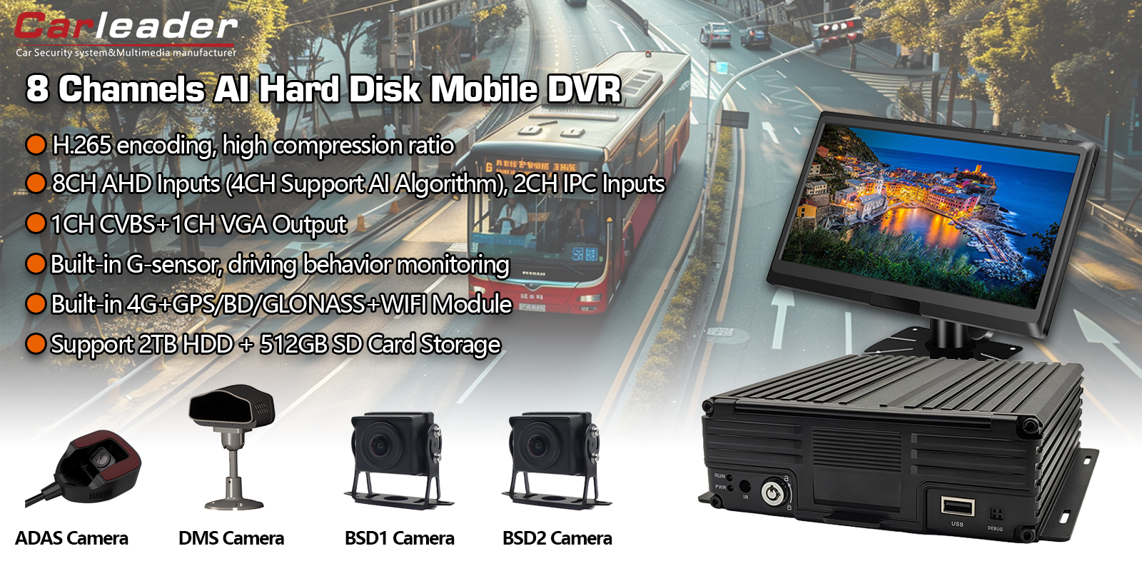 Tutvustame Carleaderit8CH AI HDD mobiilse DVR-i tugi ADAS+DMS+BSD8-kanaliline tipptasemel kõvakettaga digitaalne videosalvesti, mis on loodud professionaalseks sõidukite jälgimiseks ja intelligentseks sõidukipargi haldamiseks. Tugeva riistvarakujunduse kombineerimine täiustatud AI-algoritmidega, sealhulgas ADAS, DSM, BSD. See pakub usaldusväärset ja kvaliteetset videosalvestust, igakülgset juhiabi ja ennetavat ohutusjärelevalvet – kõike seda ühes integreeritud süsteemis.