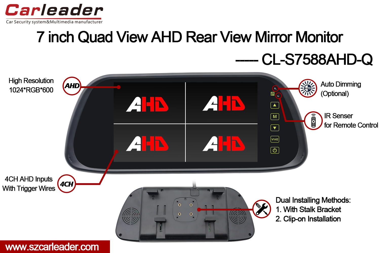 Minge versioonile üleKarleader7-tolline 4CH Quad AHD tahavaatepeegli monitor toetab kahekordset paigaldustvõrratu nähtavuse, töökindluse ja meelerahu tagamiseks teel.