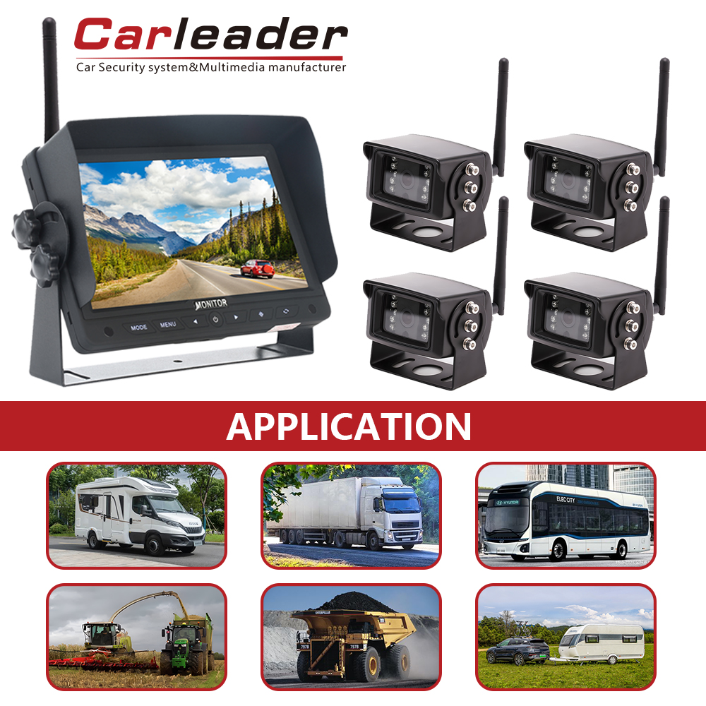 Mitmekülgsus: Carleaderi 7-tollist 2,4G digitaalset juhtmevaba 2-kanalilist jagatud ekraaniga kaamerasüsteemi saab kasutada mitmesugustel sõidukitel, sealhulgas haagissuvilatel, bussidel, veoautodel, haagistel jne.
