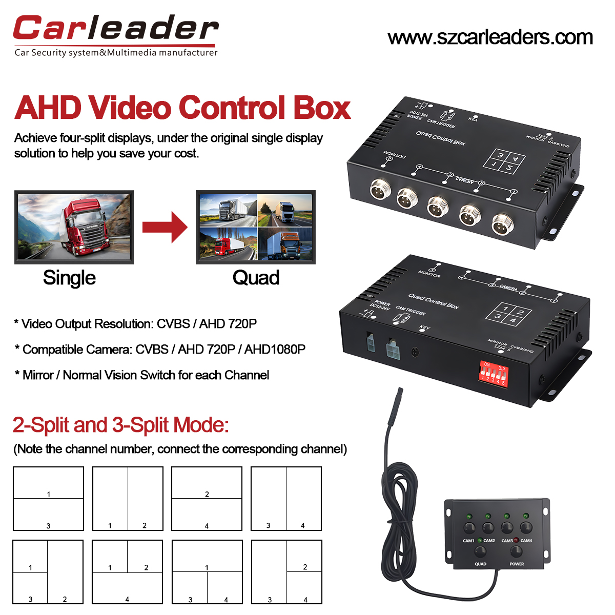 Räägime sellest, mida peate Carleaderi kohta teadmaAHD Quad View Split Box videoprotsessorraskeveokite jaoks. AHD quad split juhtpult on oluline seade sõiduki CCTV jälgimissüsteemi jaoks. Bussi veoauto video split juhtpult toetab ühe monitori muutmist neljavaatega monitoriks ja seda saab ühendada 4 AHD autokaameraga. Järgmine on AHD tahavaatekaamera videojuhtimispuldi funktsioonide, funktsioonide ja tüüpiliste kasutusjuhtude üksikasjalik selgitus.