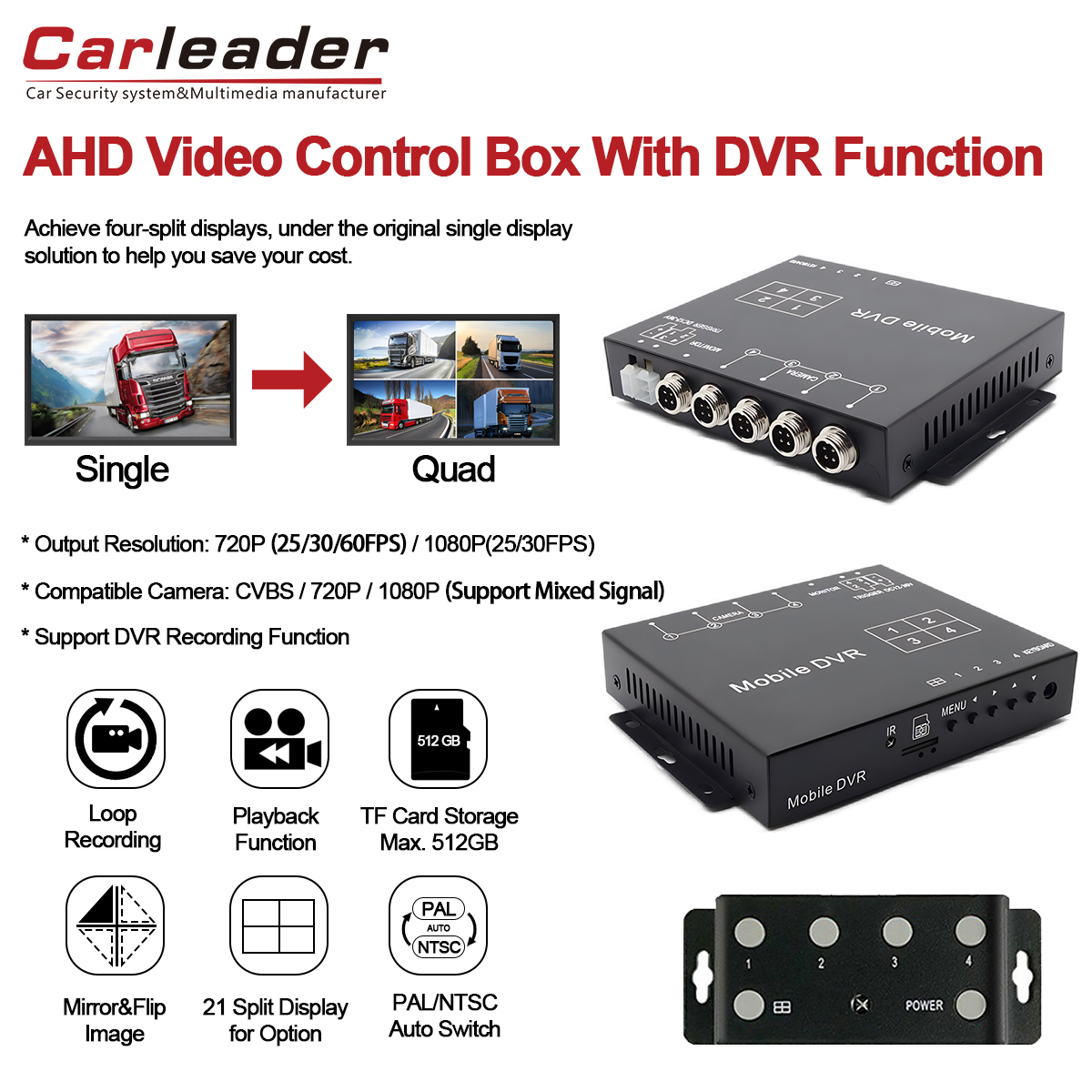 Tõstke sõiduki seiresüsteem koosCarleader 1080P AHD Quad Split Display Videoprotsessor toetab videosalvestust, mitmekülgne 4-kanaliline videojagamiskast, mis on integreeritud täiustatud DVR-i salvestusvõimalustega. See kompaktne seade, mis on loodud usaldusväärseks, paindlikuks ja kõrglahutusega jälgimiseks, sobib ideaalselt sõidukipargi haldamiseks, turvasõidukiteks või muudeks rakendusteks, mis nõuavad mitme kaameraga salvestus- ja kuvamissüsteemi.